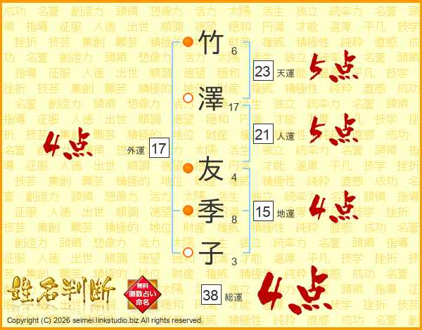竹(6画)澤(17画) 友(4画)季(8画)子(3画)
