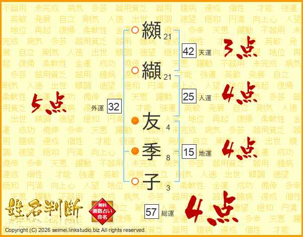 纐纈友季子さんの外運は32画の5点!
