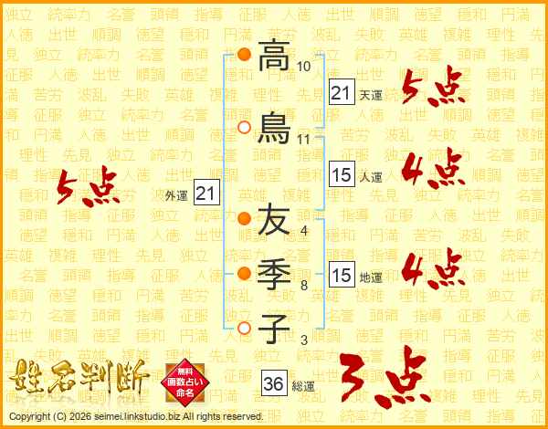 高(10画)鳥(11画) 友(4画)季(8画)子(3画)