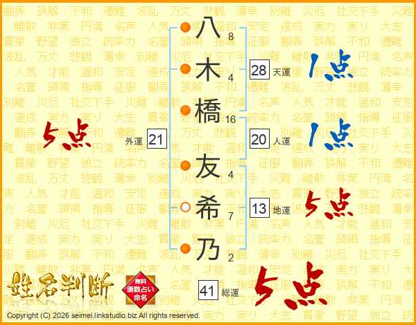 八(8画)木(4画)橋(16画) 友(4画)希(7画)乃(2画)