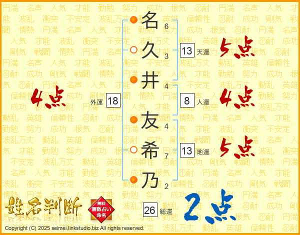 名(6画)久(3画)井(4画) 友(4画)希(7画)乃(2画)