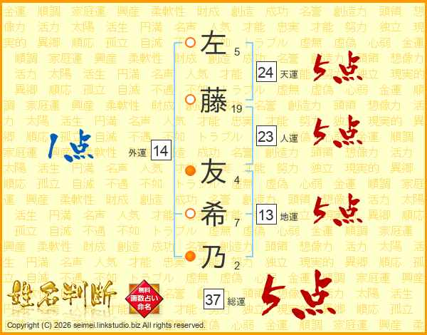 左藤友希乃さんの総運は37画の5点!