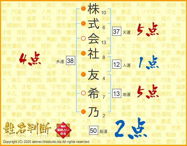 株(10画)式(6画)会(13画)社(8画) 友(4画)希(7画)乃(2画)