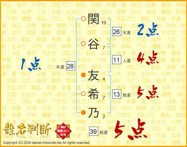関(19画)谷(7画) 友(4画)希(7画)乃(2画)