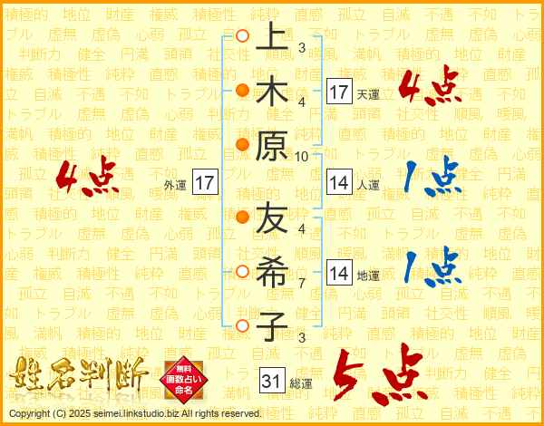 上木原友希子さんの外運は17画の4点!