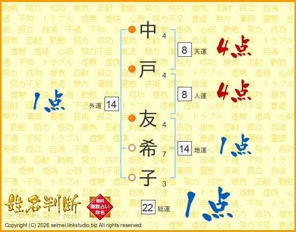 中(4画)戸(4画) 友(4画)希(7画)子(3画)