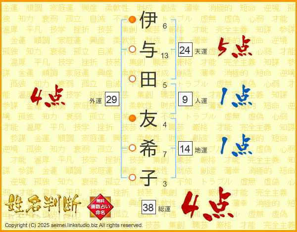 伊(6画)与(13画)田(5画) 友(4画)希(7画)子(3画)