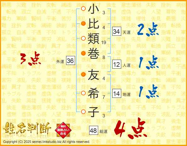 小(3画)比(4画)類(19画)巻(8画) 友(4画)希(7画)子(3画)
