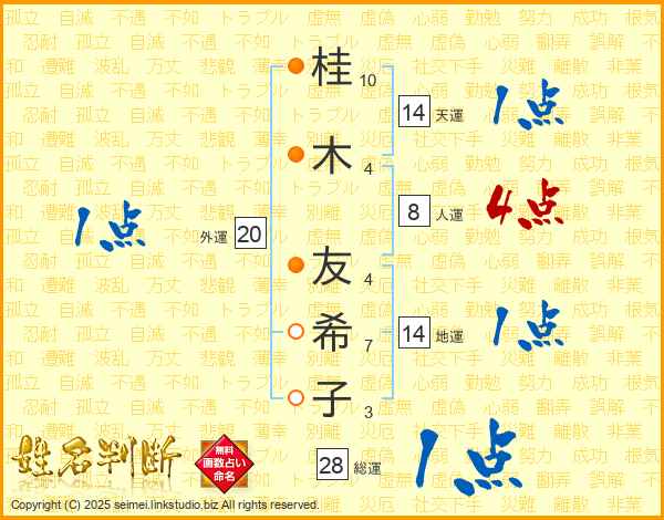 桂(10画)木(4画) 友(4画)希(7画)子(3画)