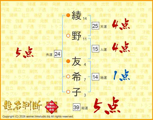 綾(14画)野(11画) 友(4画)希(7画)子(3画)