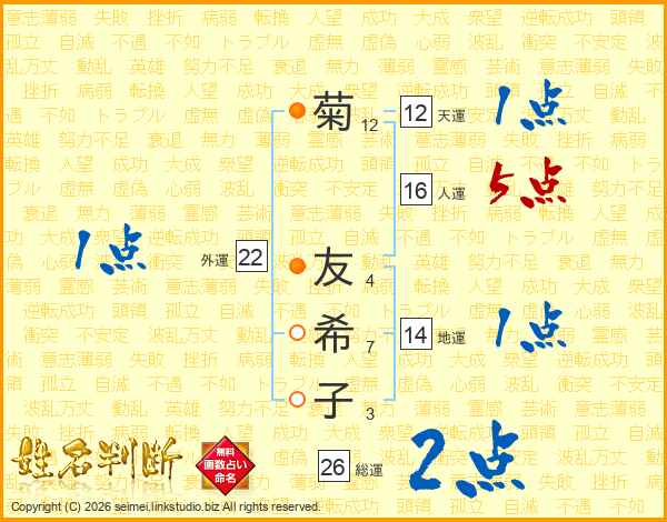 菊(12画) 友(4画)希(7画)子(3画)