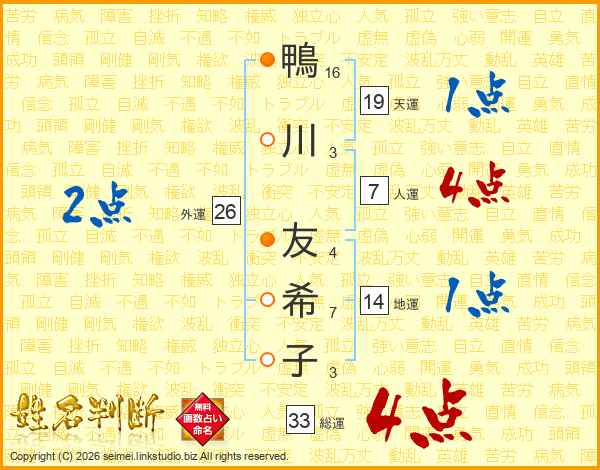 鴨(16画)川(3画) 友(4画)希(7画)子(3画)