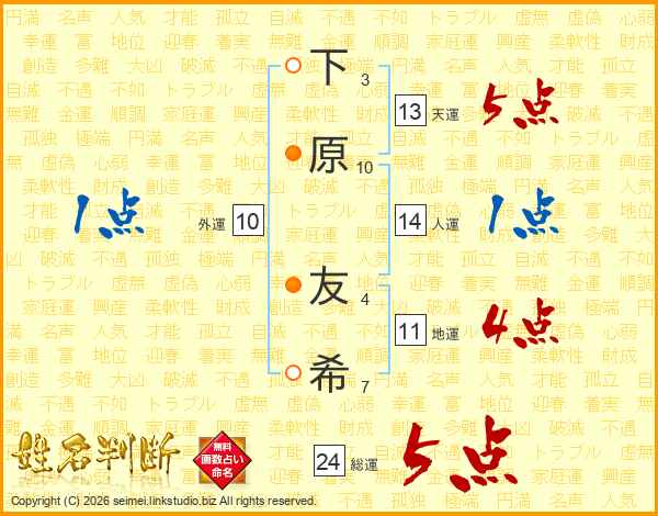下原友希さんの天運は13画の5点!