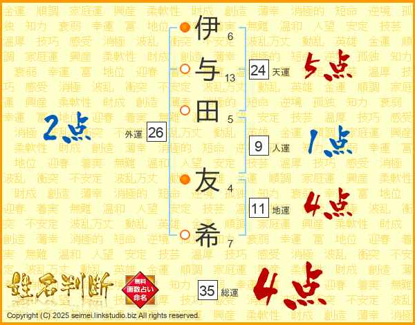 伊(6画)与(13画)田(5画) 友(4画)希(7画)