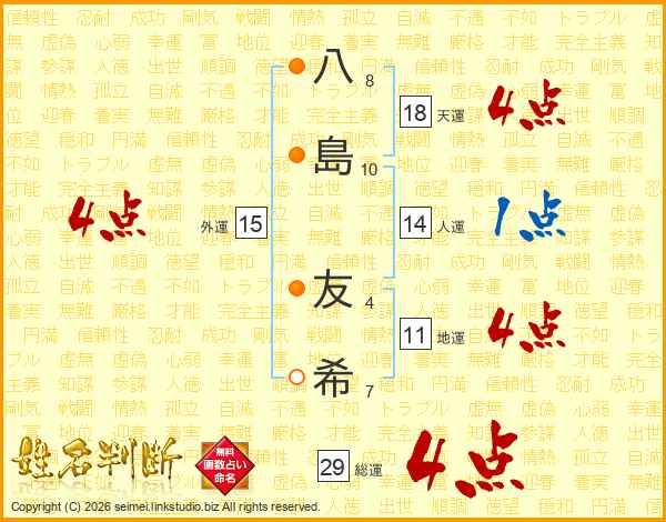 八島友希さんの総運は29画の4点!