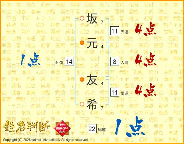 坂(7画)元(4画) 友(4画)希(7画)