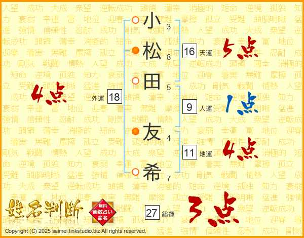 小(3画)松(8画)田(5画) 友(4画)希(7画)