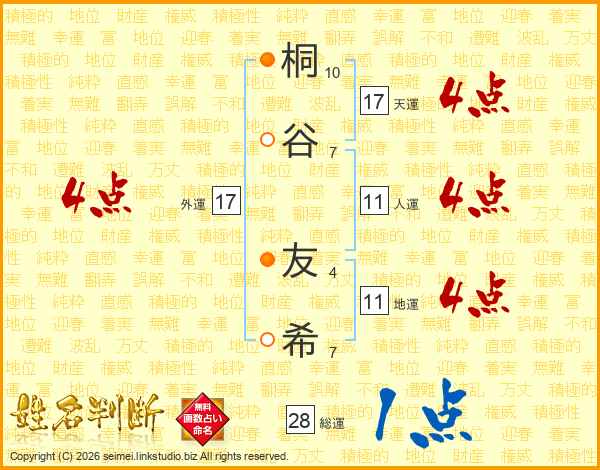 あなたの人生を表す1番重要な運勢です。生涯を通じて影響する総合運となり、主に50歳以降の晩年期に影響を及ぼします。苗字と名前の合計画数。