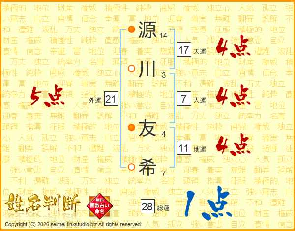 生活面を象徴する運勢です。外部から受ける影響力を表し、結婚運、家庭運や職場、環境への順応性を表します。総運から人運を引いた画数。姓や名が1文字の場合を除く。