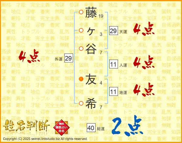 藤(19画)ヶ(3画)谷(7画) 友(4画)希(7画)