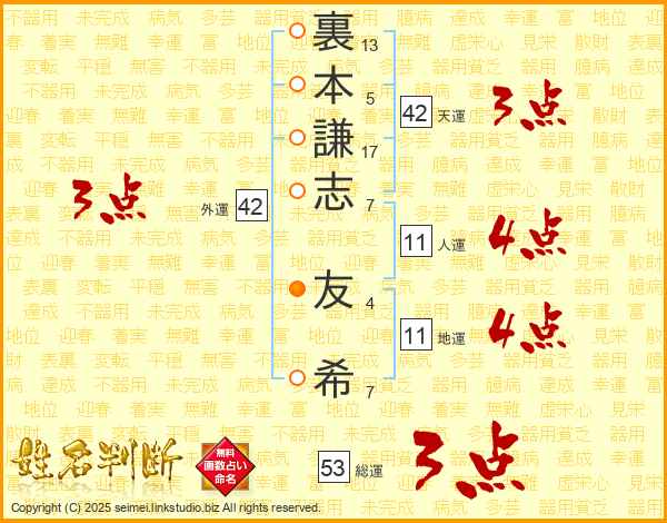 裏(13画)本(5画)謙(17画)志(7画) 友(4画)希(7画)