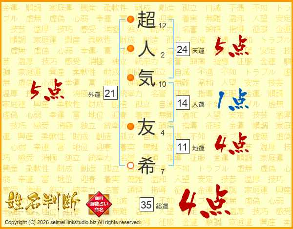 超(12画)人(2画)気(10画) 友(4画)希(7画)