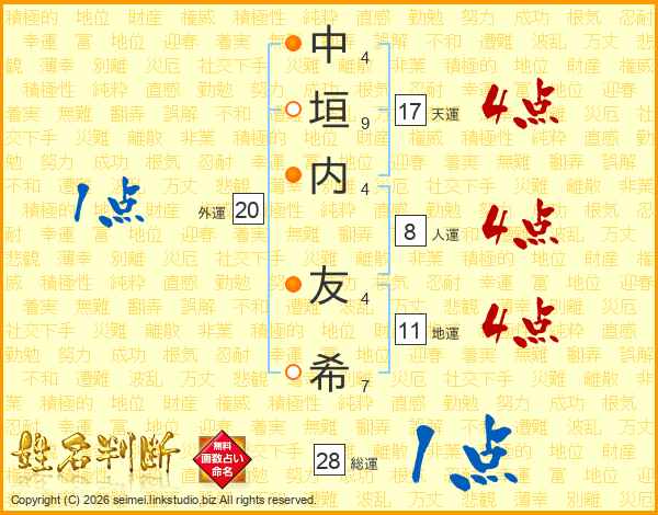 中(4画)垣(9画)内(4画) 友(4画)希(7画)