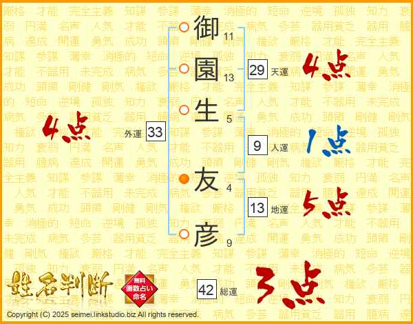 御(11画)園(13画)生(5画) 友(4画)彦(9画)