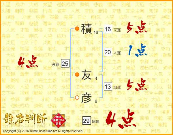 積(16画) 友(4画)彦(9画)