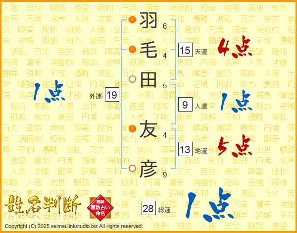 羽(6画)毛(4画)田(5画) 友(4画)彦(9画)