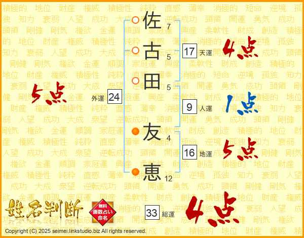 佐(7画)古(5画)田(5画) 友(4画)恵(12画)