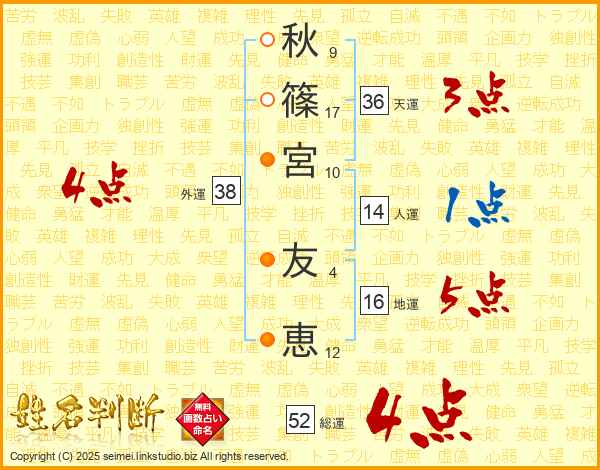 秋(9画)篠(17画)宮(10画) 友(4画)恵(12画)