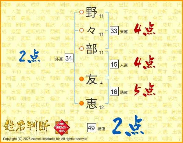 野(11画)々(11画)部(11画) 友(4画)恵(12画)