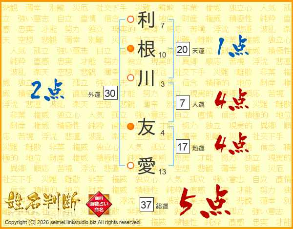 利(7画)根(10画)川(3画) 友(4画)愛(13画)