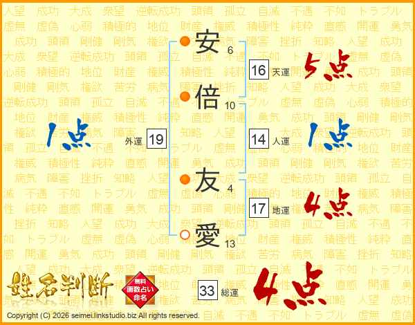 あなたの人生を表す1番重要な運勢です。生涯を通じて影響する総合運となり、主に50歳以降の晩年期に影響を及ぼします。苗字と名前の合計画数。