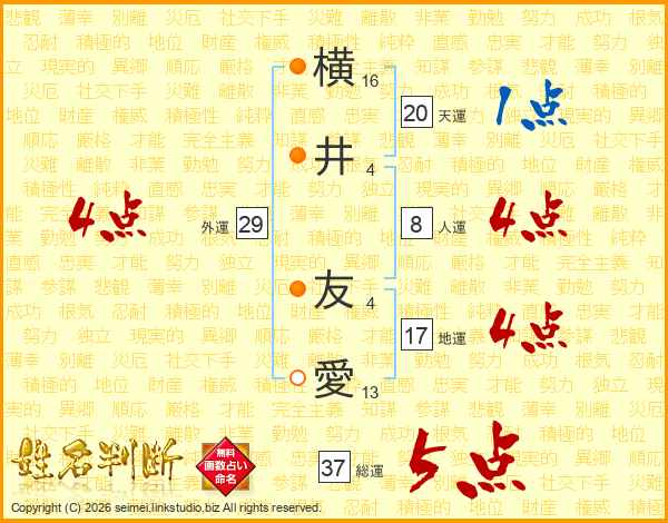 横(16画)井(4画) 友(4画)愛(13画)