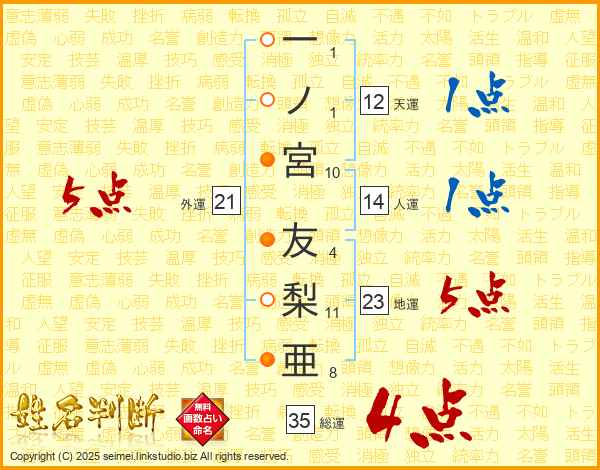 一(1画)ノ(1画)宮(10画) 友(4画)梨(11画)亜(8画)