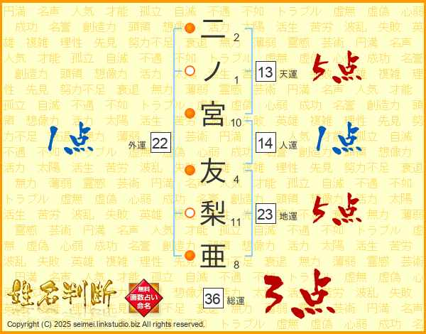 二(2画)ノ(1画)宮(10画) 友(4画)梨(11画)亜(8画)