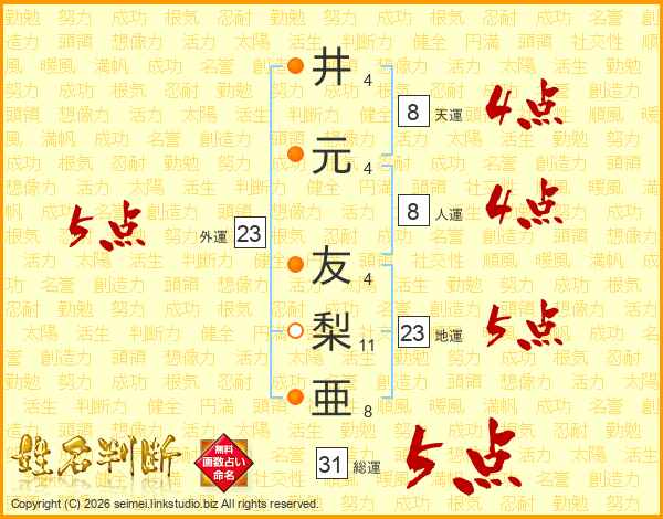 井(4画)元(4画) 友(4画)梨(11画)亜(8画)