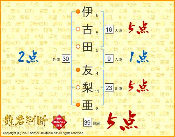 伊(6画)古(5画)田(5画) 友(4画)梨(11画)亜(8画)