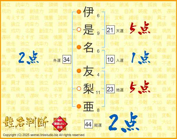 伊是名友梨亜さんの総運は44画の2点!