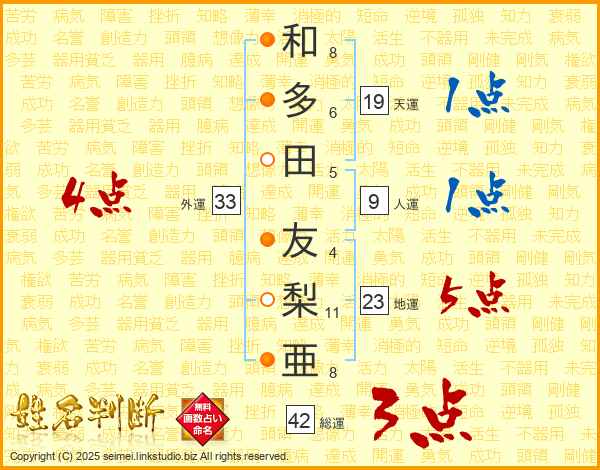 和(8画)多(6画)田(5画) 友(4画)梨(11画)亜(8画)