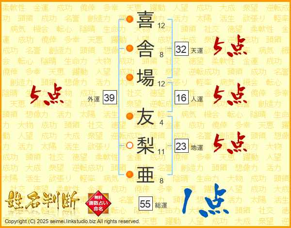 喜(12画)舎(8画)場(12画) 友(4画)梨(11画)亜(8画)