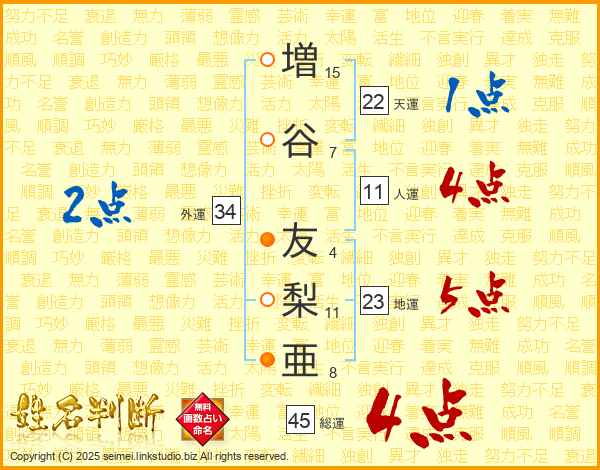 増(15画)谷(7画) 友(4画)梨(11画)亜(8画)