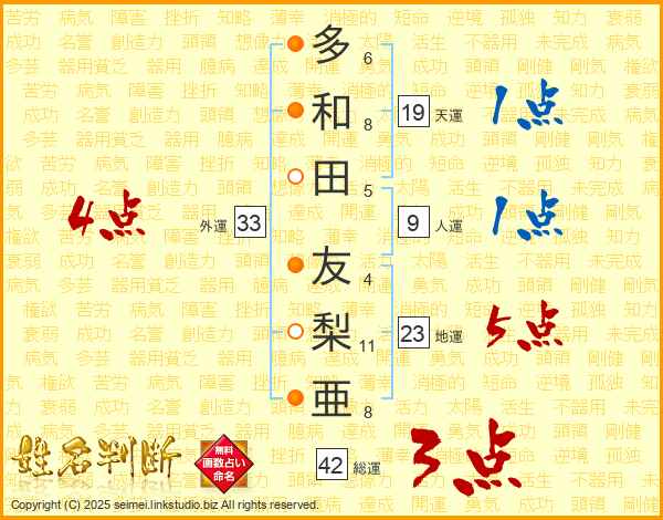 多(6画)和(8画)田(5画) 友(4画)梨(11画)亜(8画)