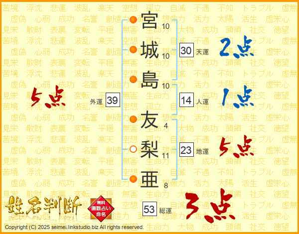 宮(10画)城(10画)島(10画) 友(4画)梨(11画)亜(8画)