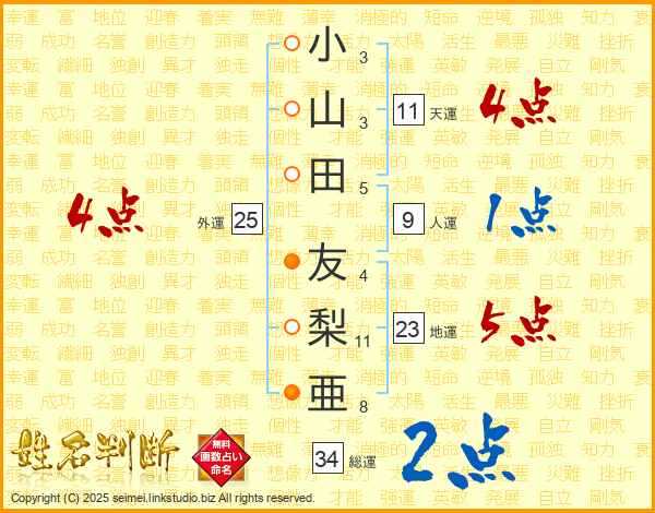 小(3画)山(3画)田(5画) 友(4画)梨(11画)亜(8画)