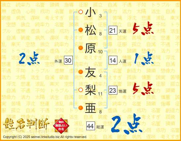 小(3画)松(8画)原(10画) 友(4画)梨(11画)亜(8画)