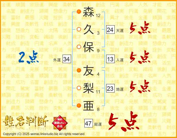 森(12画)久(3画)保(9画) 友(4画)梨(11画)亜(8画)