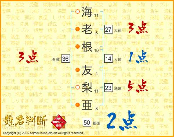 海(11画)老(6画)根(10画) 友(4画)梨(11画)亜(8画)